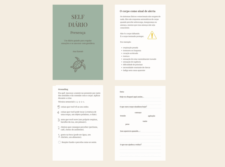 Cada página funciona como um retorno ao presente. Um lugar onde você pode respirar, se escutar e se ancorar, mesmo nos dias em que tudo parece demais. A escrita não pressiona, não exige conclusão e não cobra constância perfeita.